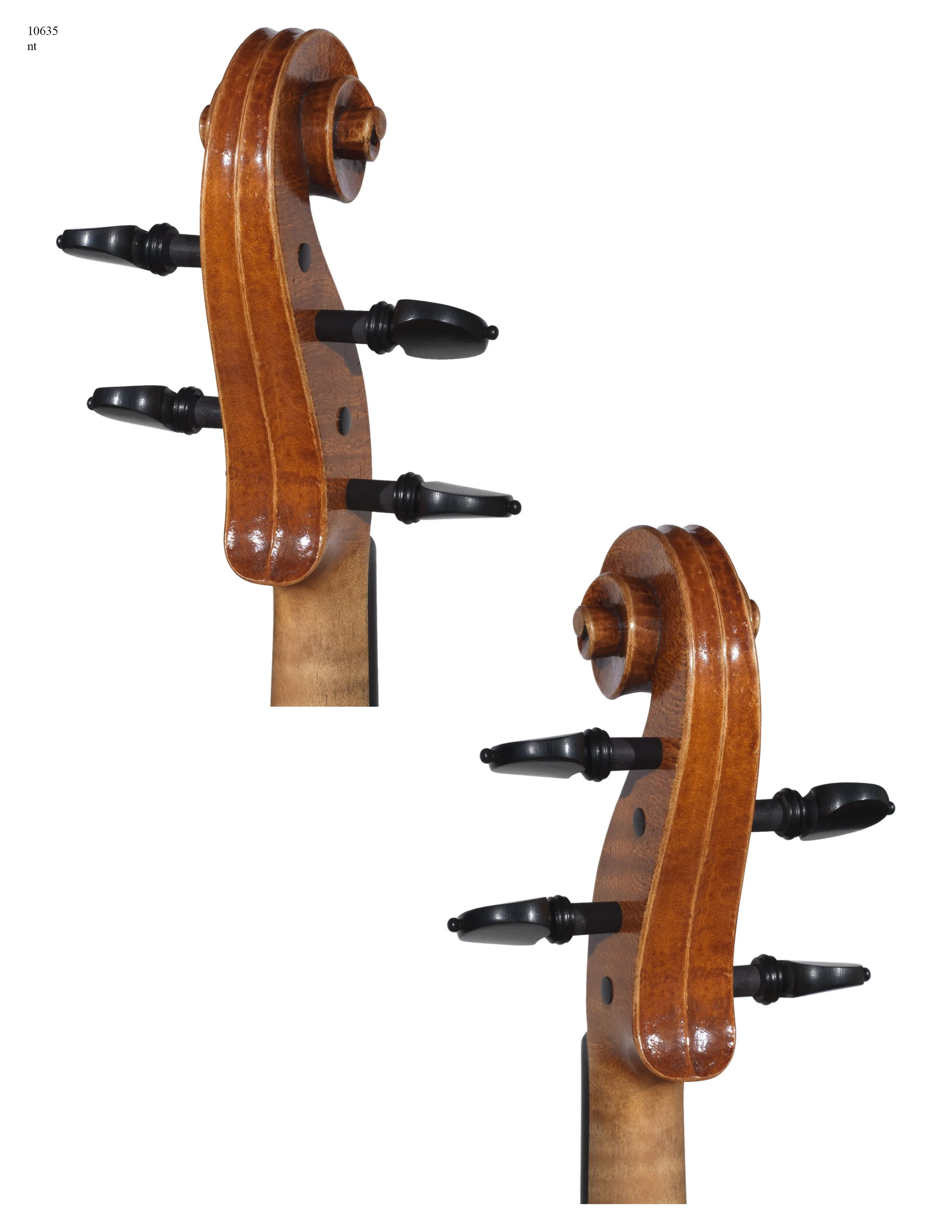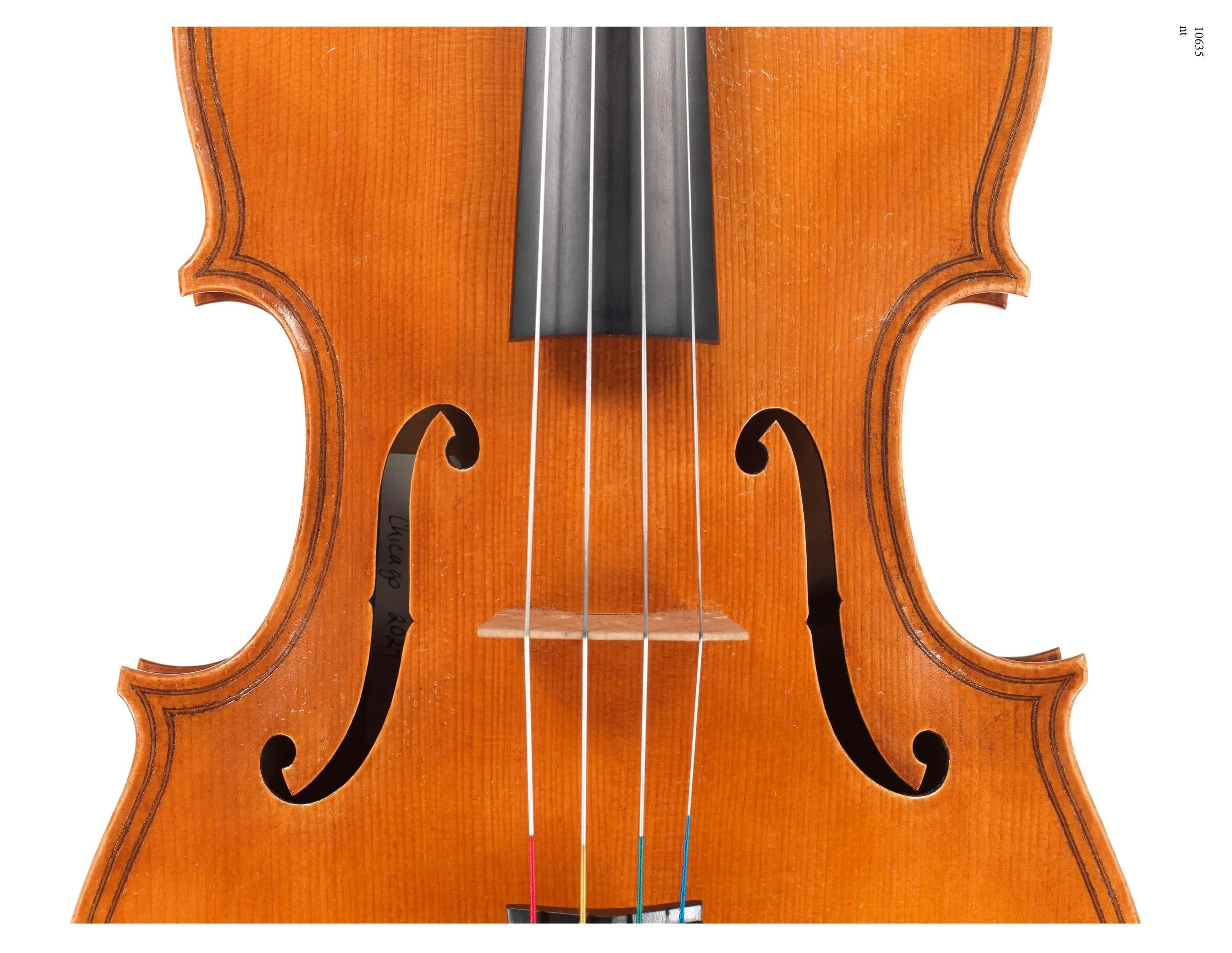 This violin is based on Stradivari's "PG" mold. It is not a copy of one particular violin, rather the corners, scroll, and FFs were inspired from some of my favorite examples of Stradivari's work. My handedness shows through in the workmanship on this violin, making it not quite a personal model, but also not a strict copy.